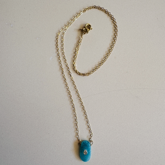 Collier délicat composé d'une fine chaîne en gold filled 14k, sublimé d'une amazonite sertie sur laquelle est posée une petite larme en strass