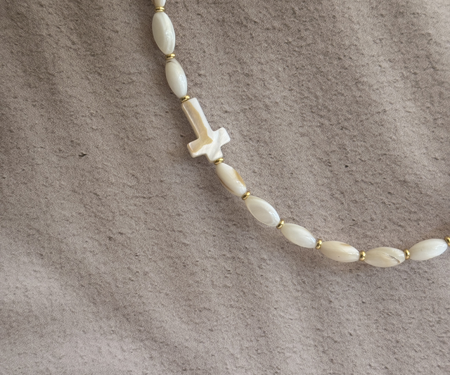 Un collier en perles nacrées rehaussé d’intercalaires dorés, et d'une croix en nacre.