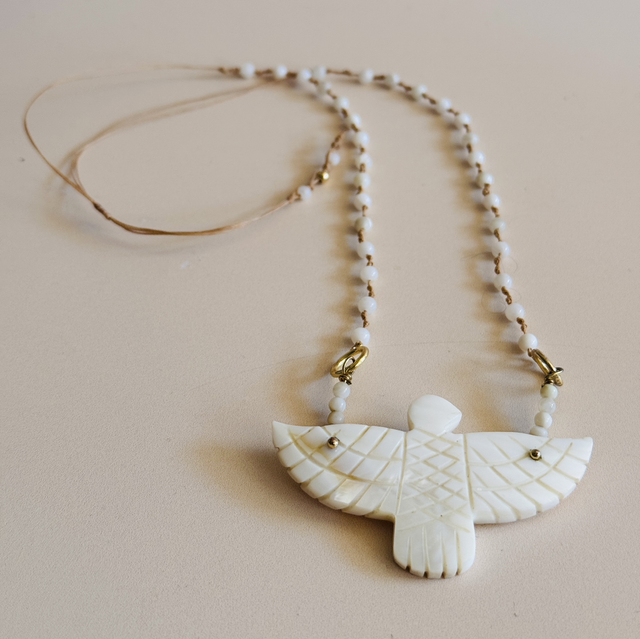 Collier composé de pierres naturelles en opales blanches. Un aigle en opale blanche en pierre centrale.