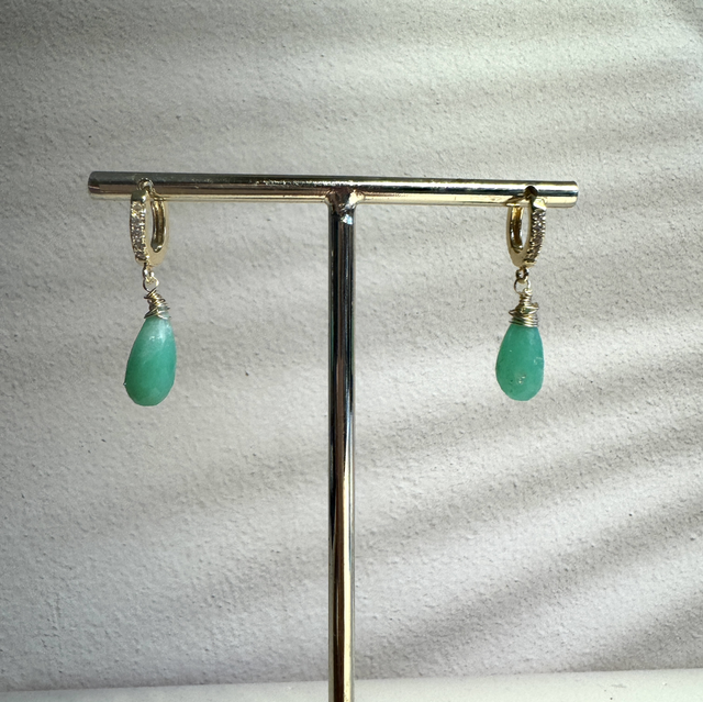 Gouttes en chrysoprase serties en suspension sur créole dorée à l'or fin 18 k , soulignée d’or fin pour une touche solaire et vibrante .