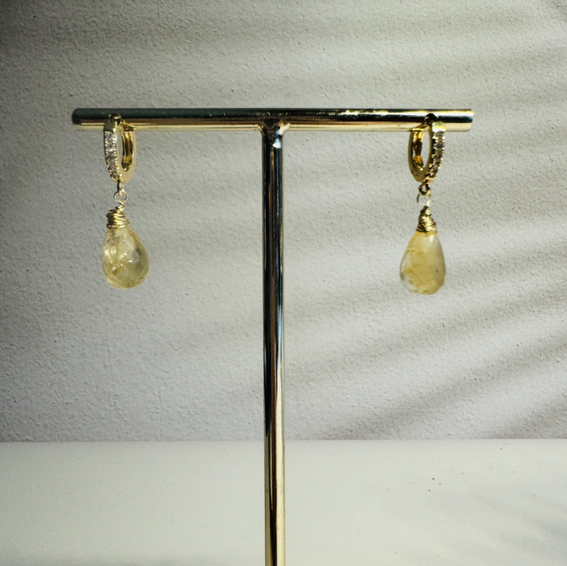 Gouttes en citrine serties en suspension sur créole dorée à l'or fin 18 k , soulignée d’or fin pour une touche solaire et vibrante .