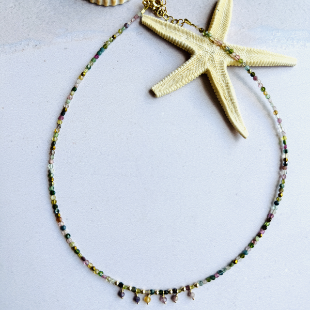 Un ras du cou de perles fines en tourmaline , souligné par des pampilles en tourmaline, comme des éclats suspendus à la lumière.