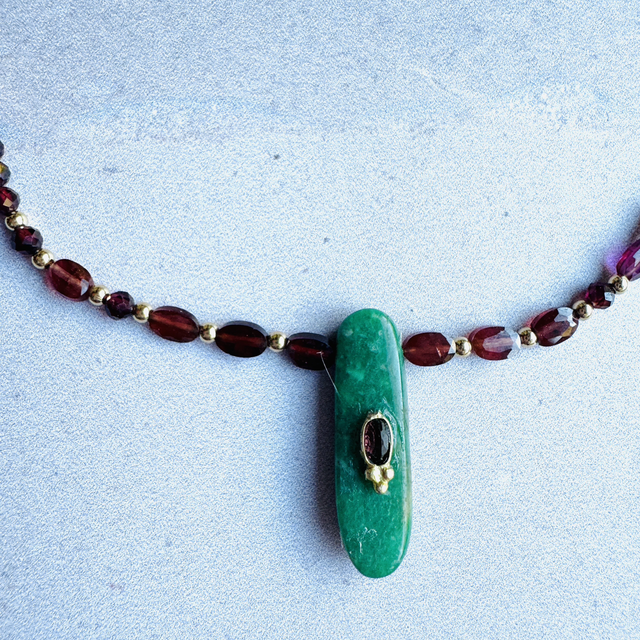 Un collier en grenat monté sur un fil doré , d'une pierre centrale en amazonite agrémentée d'un grenat serti.