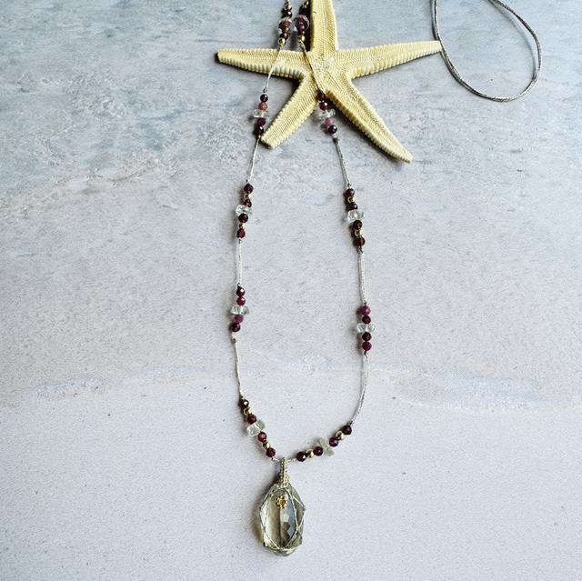 Cabochon central facetté en améthyste verte, mis en lumière par un macramé délicat et monté sur un fil doré, noué avec des grenats et améthystes vertes .