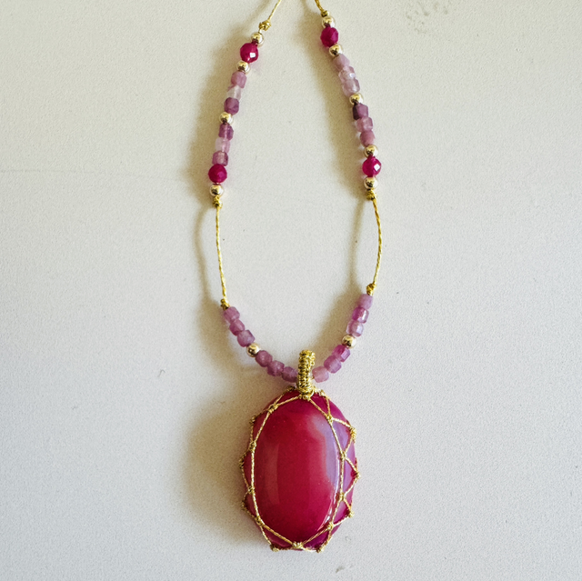 Cabochon central en calcédoine teintée, mis en lumière par un macramé délicat et monté sur un fil doré, noué avec des pierres fines en grenat