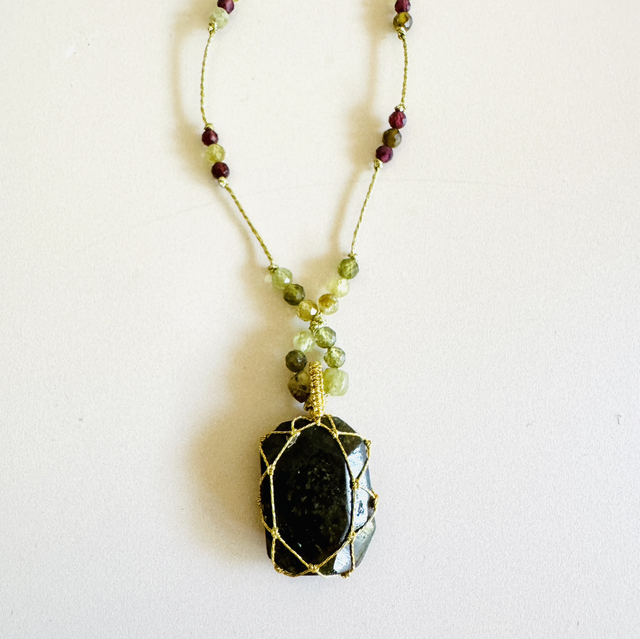 Pierre centrale en grenat vert, mise en lumière par un macramé délicat et montée sur un fil doré, noué avec des pierres fines en grenat vert , grenat rouge et perles en gold filled
