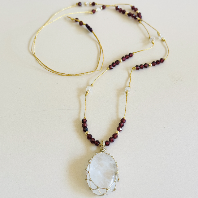Cabochon central en pierre de lune, mis en lumière par un macramé délicat et monté sur un fil doré, noué avec des pierres fines en grenat rouge