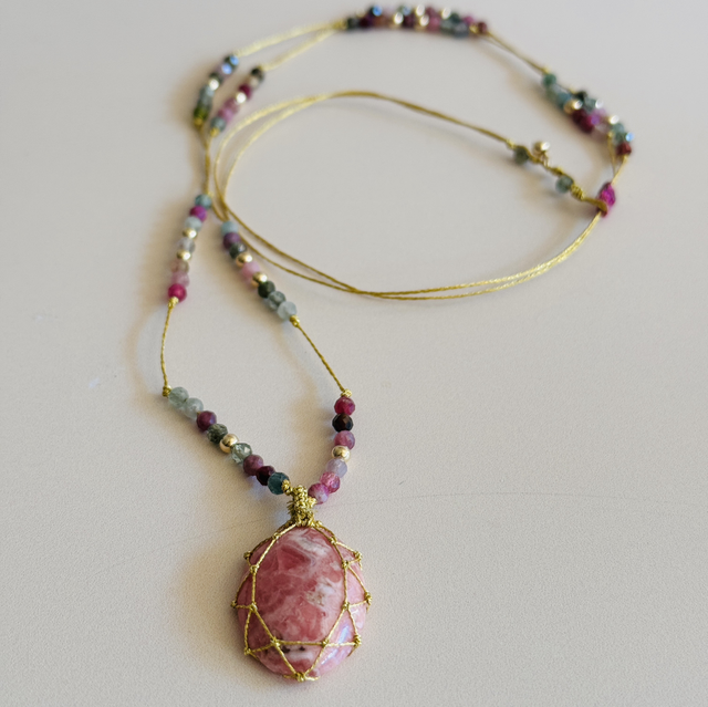 Cabochon central en rhodochroxsite, mis en lumière par un macramé délicat et monté sur un fil doré, noué avec des tourmalines